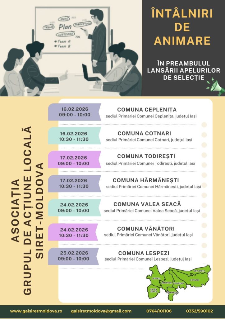ASOCIAȚIA GRUPUL DE ACȚIUNE LOCALĂ SIRET-MOLDOVA, în calitate de Beneficiar al Contractului de Finanțare nr. C 3601F210017812400085/01.10.2024, pentru implementarea proiectului Sprijin pentru gestionarea, monitorizarea și evaluarea strategiei de dezvoltare locală, precum și animarea acesteia, inclusiv facilitarea schimburilor între părțile interesate – DR – 36F, vă transmite detalii cu privire la calendarul activităților programate în Trim. I – An 2026.