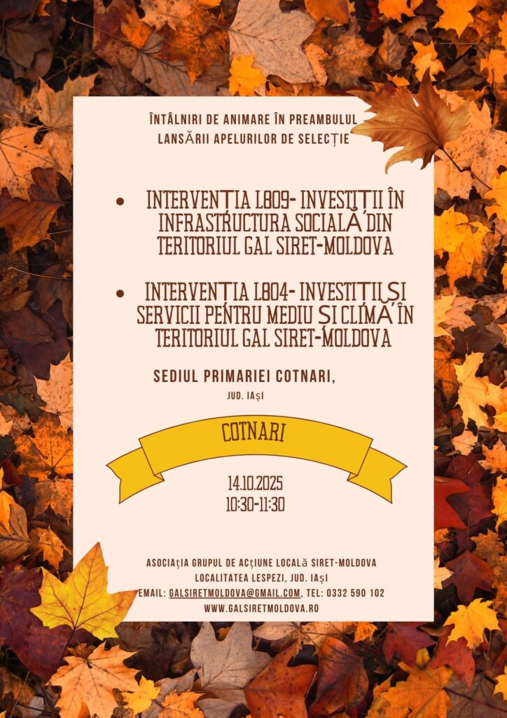 Vă invităm să luați parte la aceste întâlniri pentru a afla cum puteți beneficia de sprijinul oferit prin fonduri europene și pentru a contribui la dezvoltarea comunității voastre!